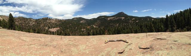 Panaramic view with #8 T-box just to the right of center. Click image to see the fullsize (6.2MB It may take a while to load.) picture. At the upper edge of the rock, just above the right front corner of the T-box is a red oval outlining the location of the #8 Basket.